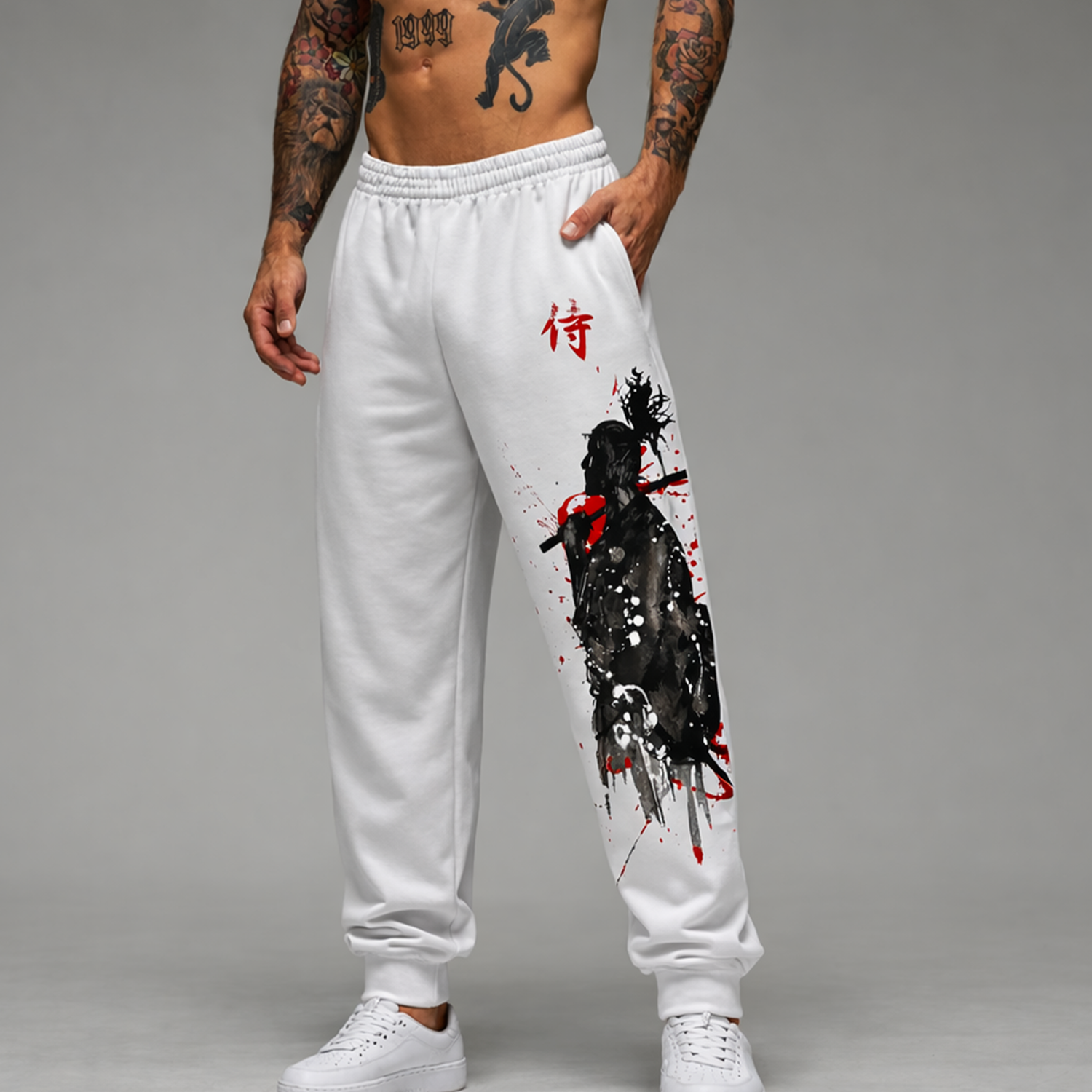 The Samurai Joggers featuring the japanese kanji symbol of samurai and on the back a black samurai in his blodshed. Crafted from premium polyester, the Samurai Joggers is a perfect choice for your style, inspired from the streer arts of Tokyo.